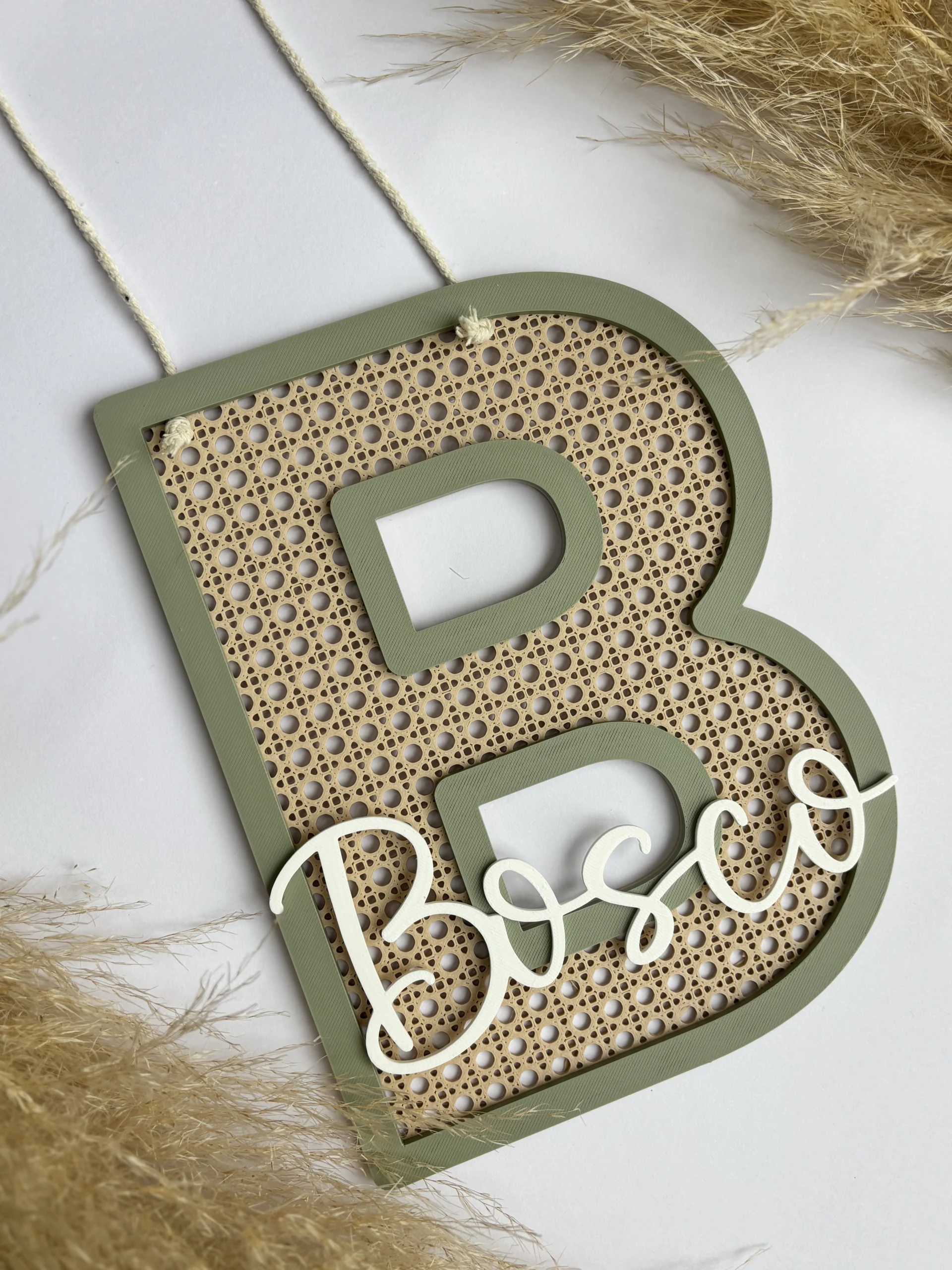 Personalízala con la inicial, el color del borde, el tono del ratán y el nombre que desees.